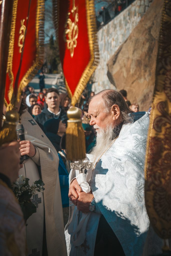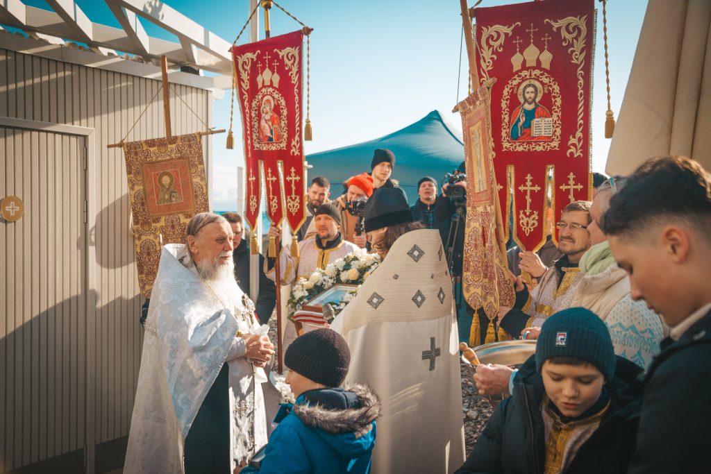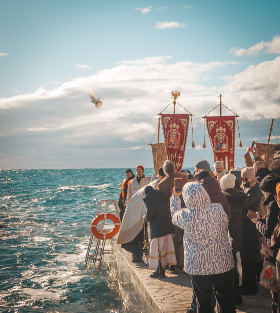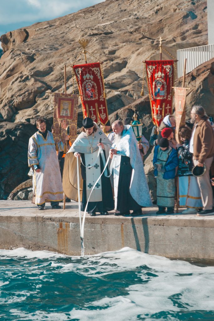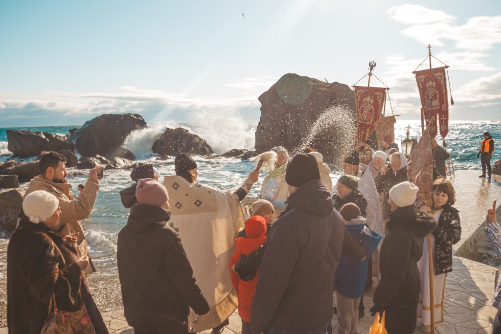 Верующие во главе с духовенством прошли от храма Архангела Михаила к Детскому пляжу, где был совершен торжественный Чин великого освящения вод Черного моря.