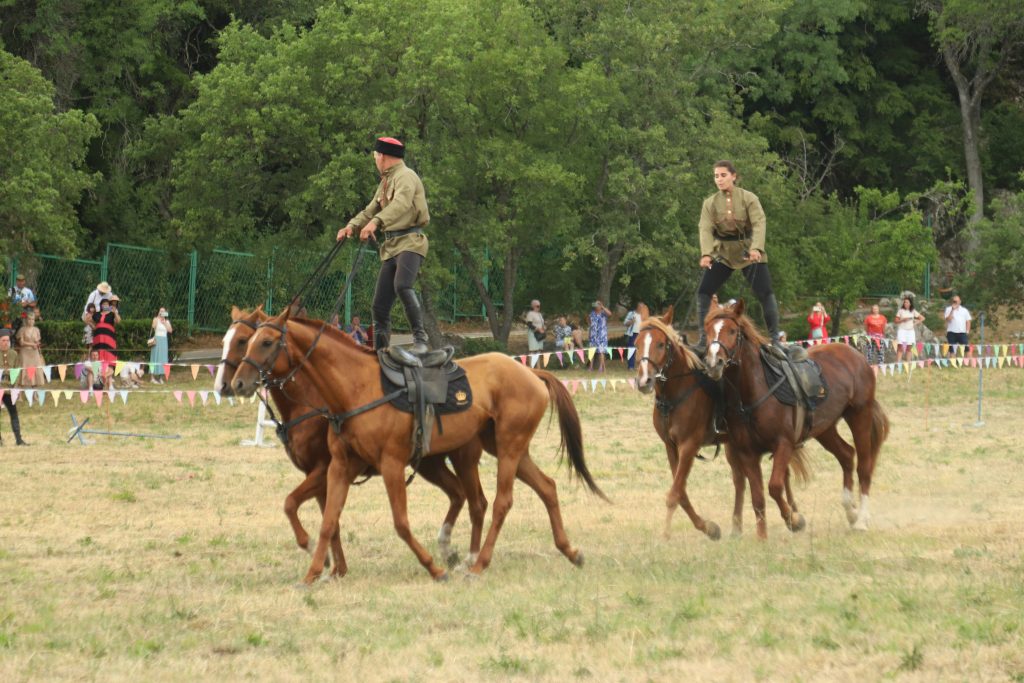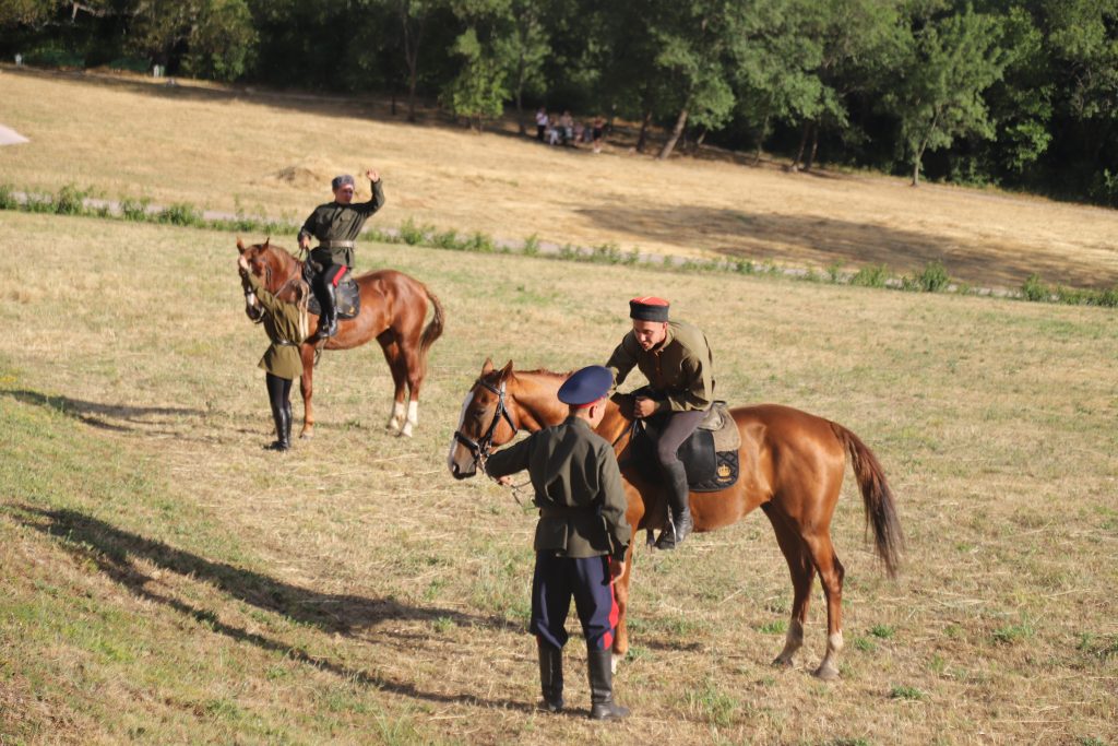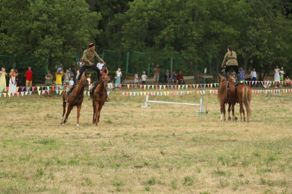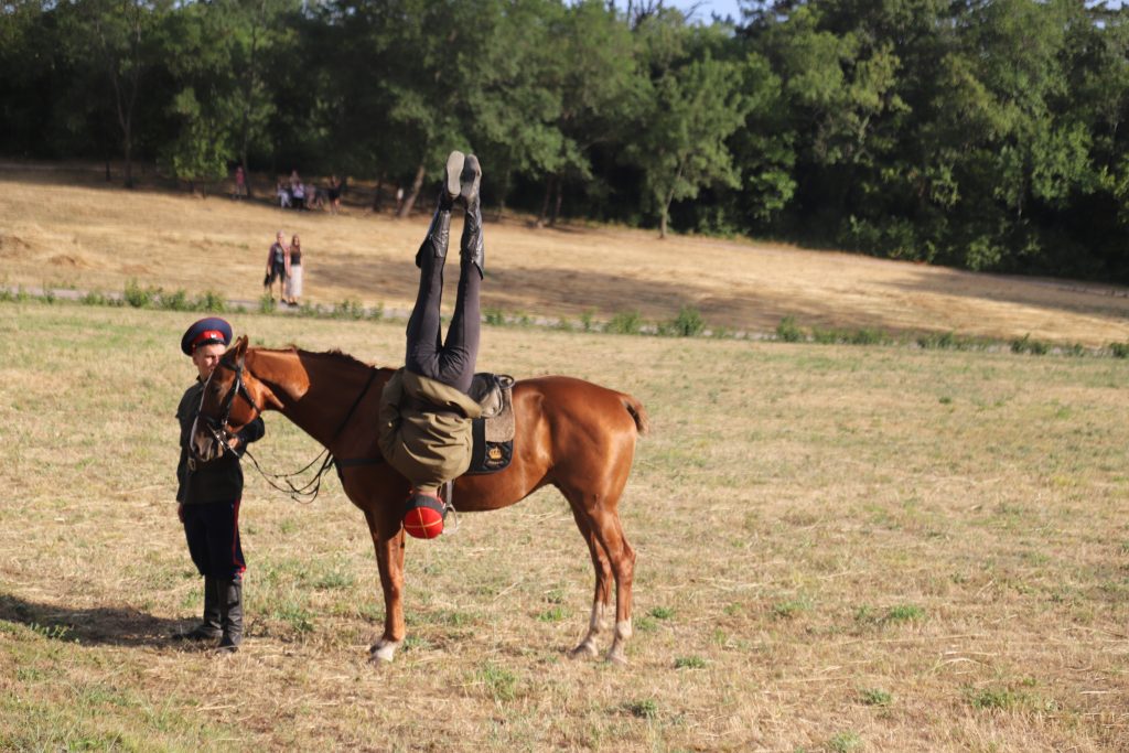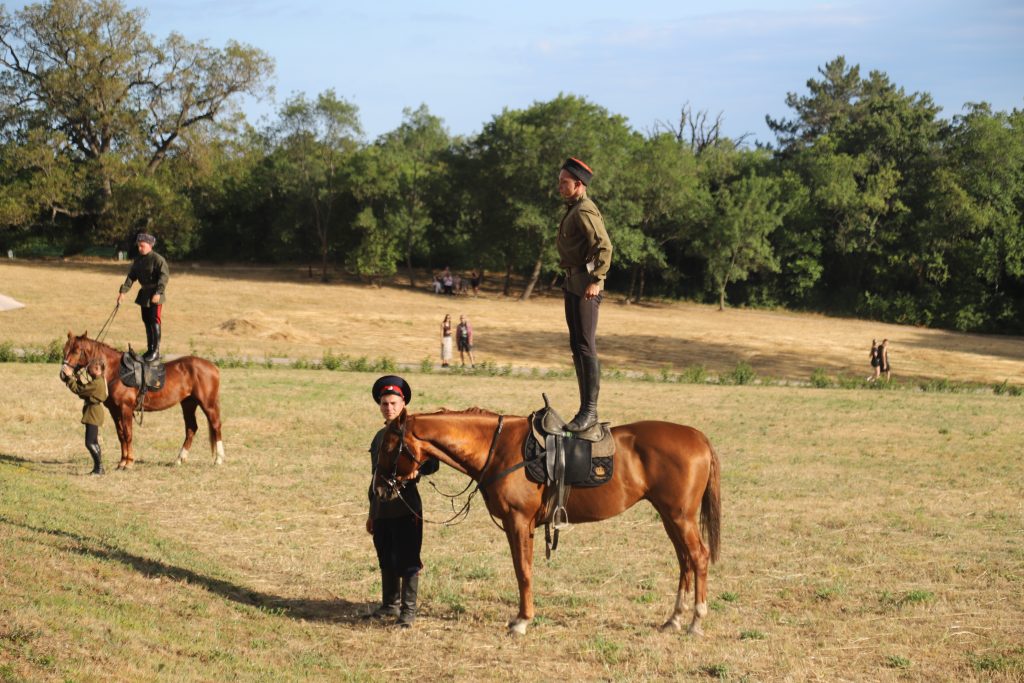 Событийное мероприятие продолжилось разнообразной интерактивной программой. Яркие и запоминающиеся эмоции гостям праздника подарила виртуозная конная джигитовка «Сохраняя традиции», специально подготовленная сотрудниками музея-заповедника М.А. Шолохова и ставшая настоящим украшением праздника. Конное выступление включало в себя большой диапазон приемов джигитовки, которой издавна в Войске Донском придавалось большое значение, ей должен был владеть каждый казак.