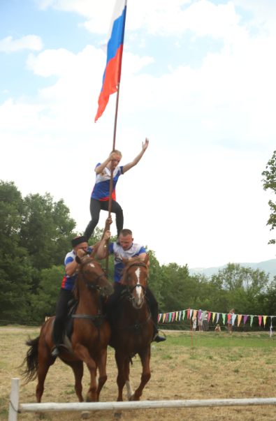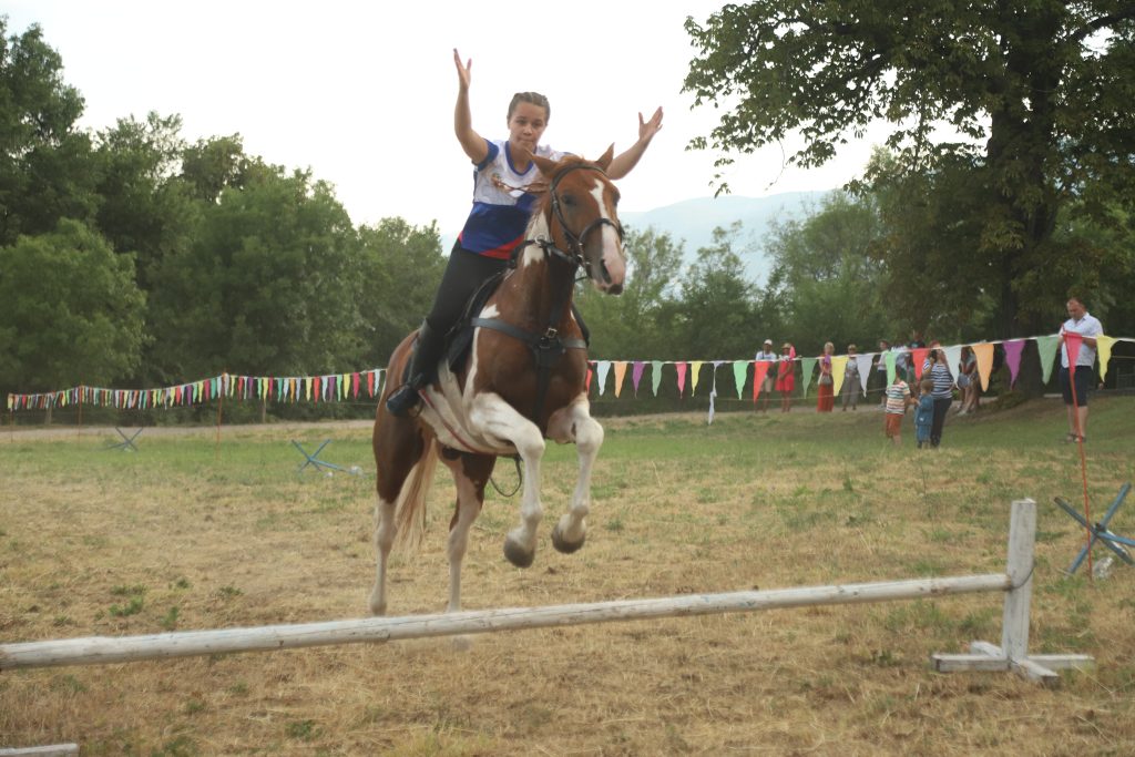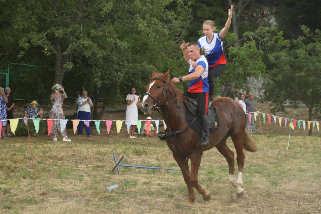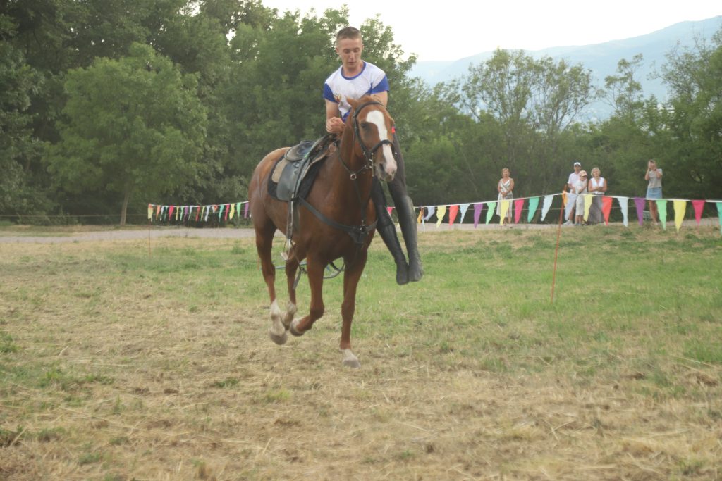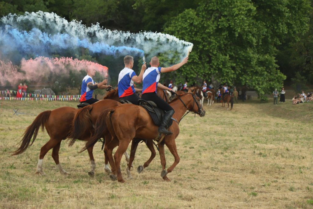 Событийное мероприятие продолжилось разнообразной интерактивной программой. Яркие и запоминающиеся эмоции гостям праздника подарила виртуозная конная джигитовка «Сохраняя традиции», специально подготовленная сотрудниками музея-заповедника М.А. Шолохова и ставшая настоящим украшением праздника. Конное выступление включало в себя большой диапазон приемов джигитовки, которой издавна в Войске Донском придавалось большое значение, ей должен был владеть каждый казак.