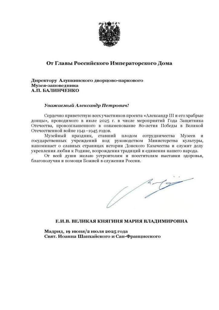 Торжественную часть событийного мероприятия открыл директор Алупкинского музея-заповедника Балинченко Александр Петрович. В приветственном слове он отметил, что межмузейный проект «Император Александр III и его «храбрые донцы» является важным событием в развитии межрегионального музейного сотрудничества, наглядно представляет нравственные идеи, значимую роль православия в жизни донских казаков, на протяжении веков служивших верой и правдой российским Государям и Отечеству.