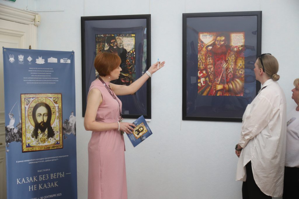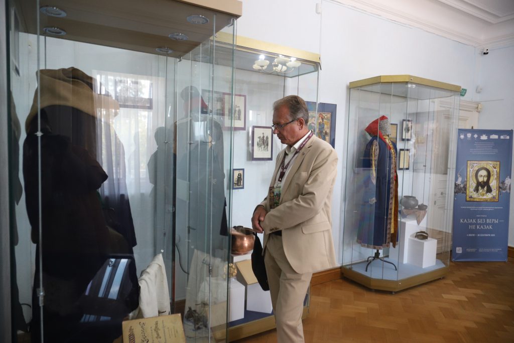 Музейный праздник продолжился в залах Массандровского дворца презентацией новой выставки «Казак без веры – не казак!» из собрания Ростовского областного музея краеведения и Новочеркасского музея истории Донского казачества. С разделами экспозиции и её уникальными экспонатами присутствующих познакомили Чибисова Светлана Павловна и Каледина Александра Олеговна. В ходе экскурсионного обзора они отметили, что представленные на выставке предметы из коллекций музеев отражают духовную миссию и историческую роль донского казачества в контексте российской истории. На примере редких музейных предметов, как типичных в казачьем быту того времени, так и редких образцов духовной жизни донцов, зрители узнали, о том, как донское казачество на протяжении столетий хранило и приумножило свою культуру, менталитет, традиции воинской службы, передав новым поколениям исконные духовные ценности.