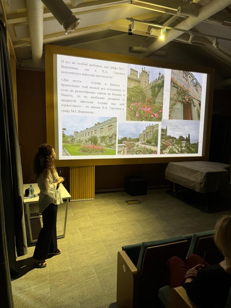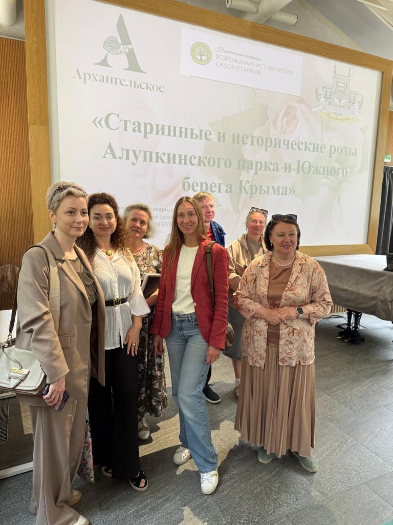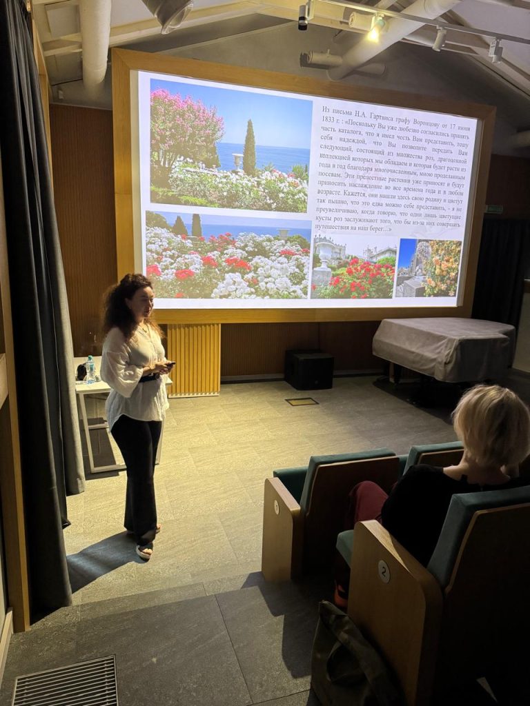 6 июля 2025 г в лектории ФГБУК Музей- заповедник «Архангельское», в рамках «Фестиваля роз и Ботанических затей» Светлана Плугатарь, кандидат биологических наук, главный хранитель парков ГАУК РК «Алупкинский дворцово-парковый музей-заповедник, прочла лекцию «Старинные и исторические розы Алупкинского парка и Южного берега Крыма», которая была посвящена розарию Алупкинского имения графа Михаила Семеновича Воронцова, международной научной классификации старинных роз, вопросам сохранения старинных сортов роз и воссоздания исторических розариев дворянских усадеб, истории селекции отечественных и зарубежных старинных сортов роз, а так же рассказала о социокультурном проекте «Музейная роза: история, рассказанная растением», инсценированном Национальной Ассоциацией «Возрождение исторических садов и парков».