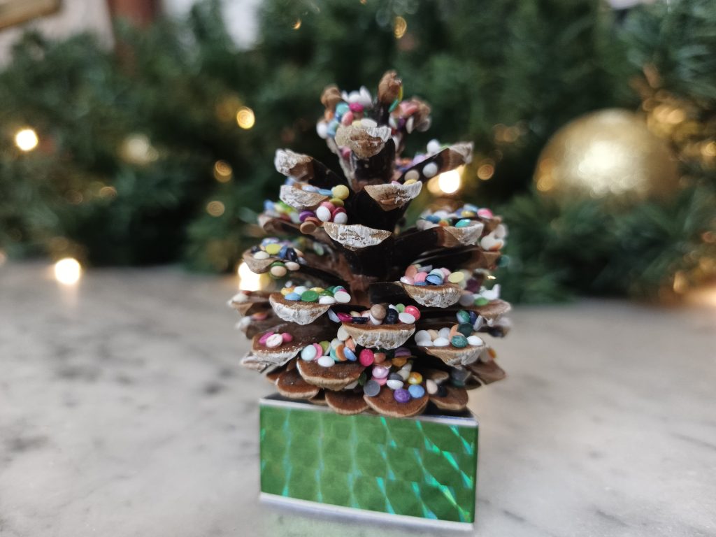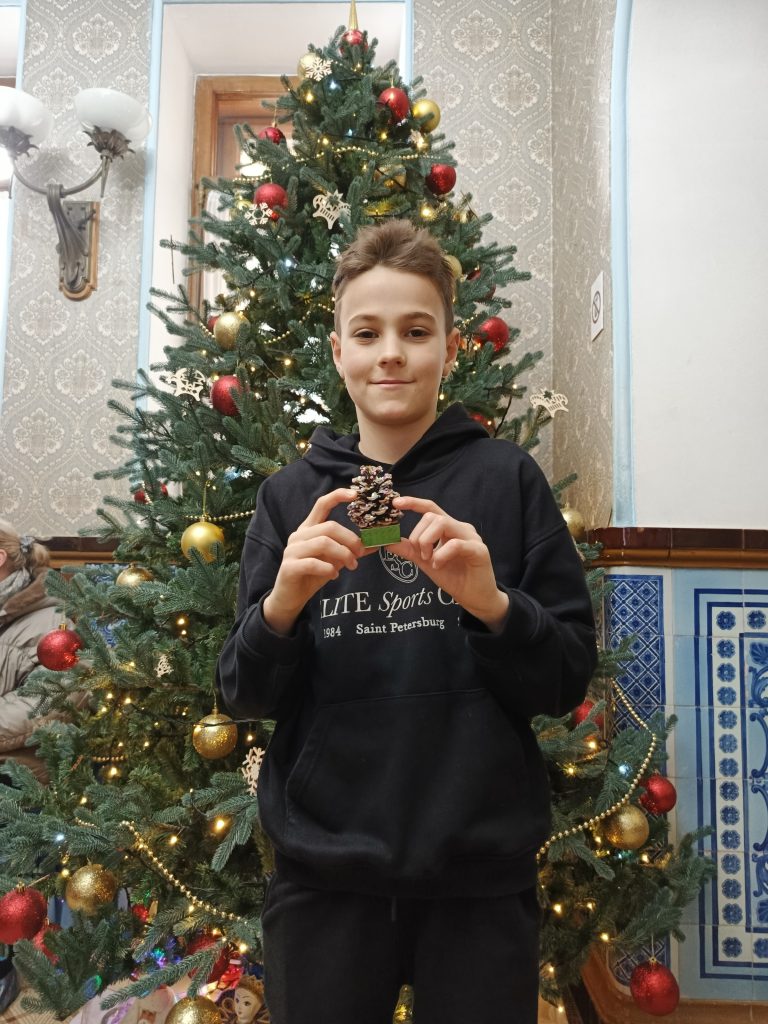 По окончании тематической беседы, посетители с удовольствием к творческому занятию и попробовали себя в роли творцов. Украшая сосновые шишки блестками и бусинами, каждый смог создать для себя неповторимый сувенир-елочку.