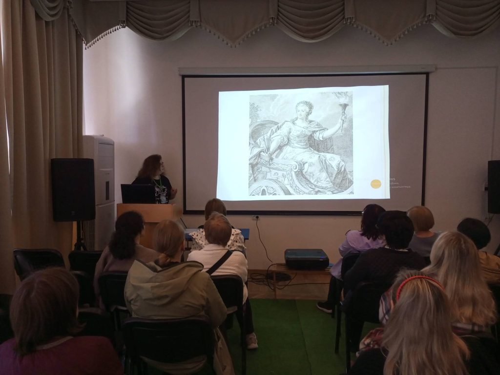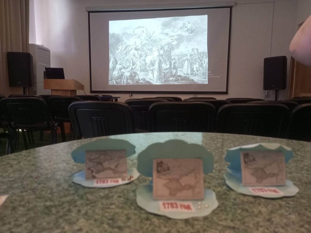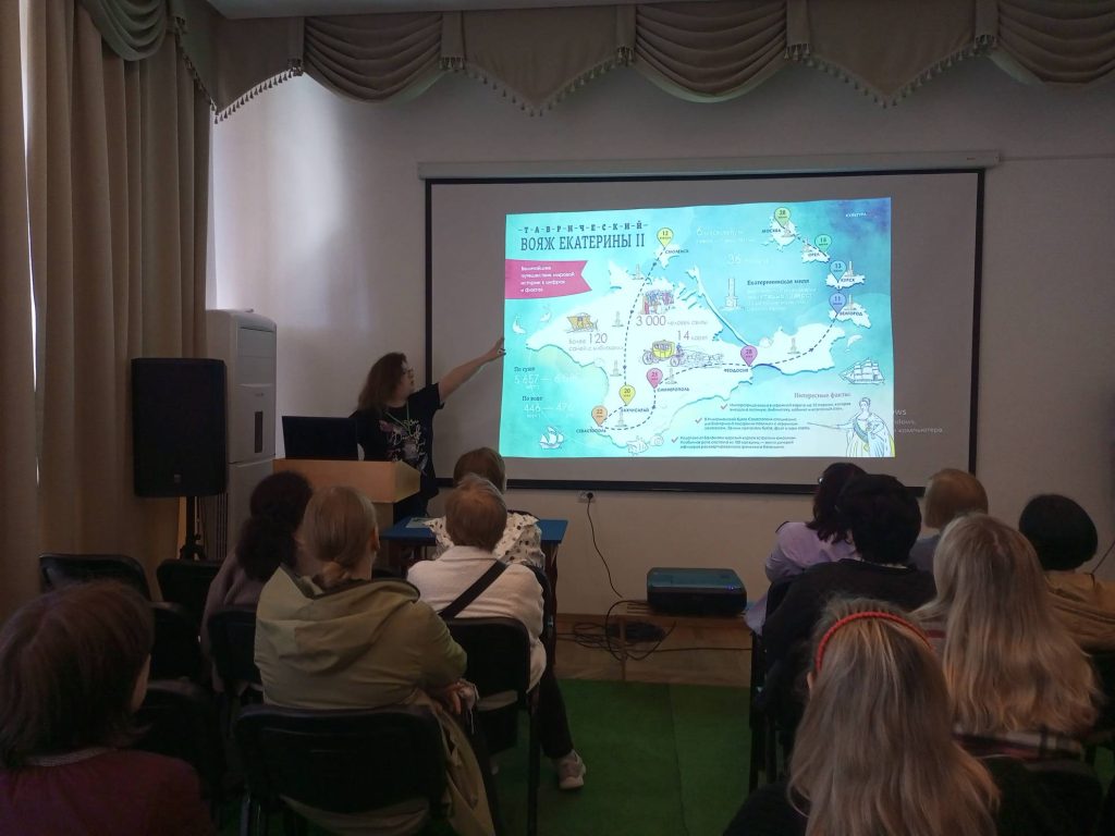 В интерактивной форме посетители познакомились с гравюрой Жан Жака Авриля «Екатерина II, путешествующая в своем государстве» с картины художника Фердинанда де Мейса из экспозиции Массандровского дворца-музея, слушателям представили историю создания гравюры, рассказали об аллегориях и символах этого произведения.