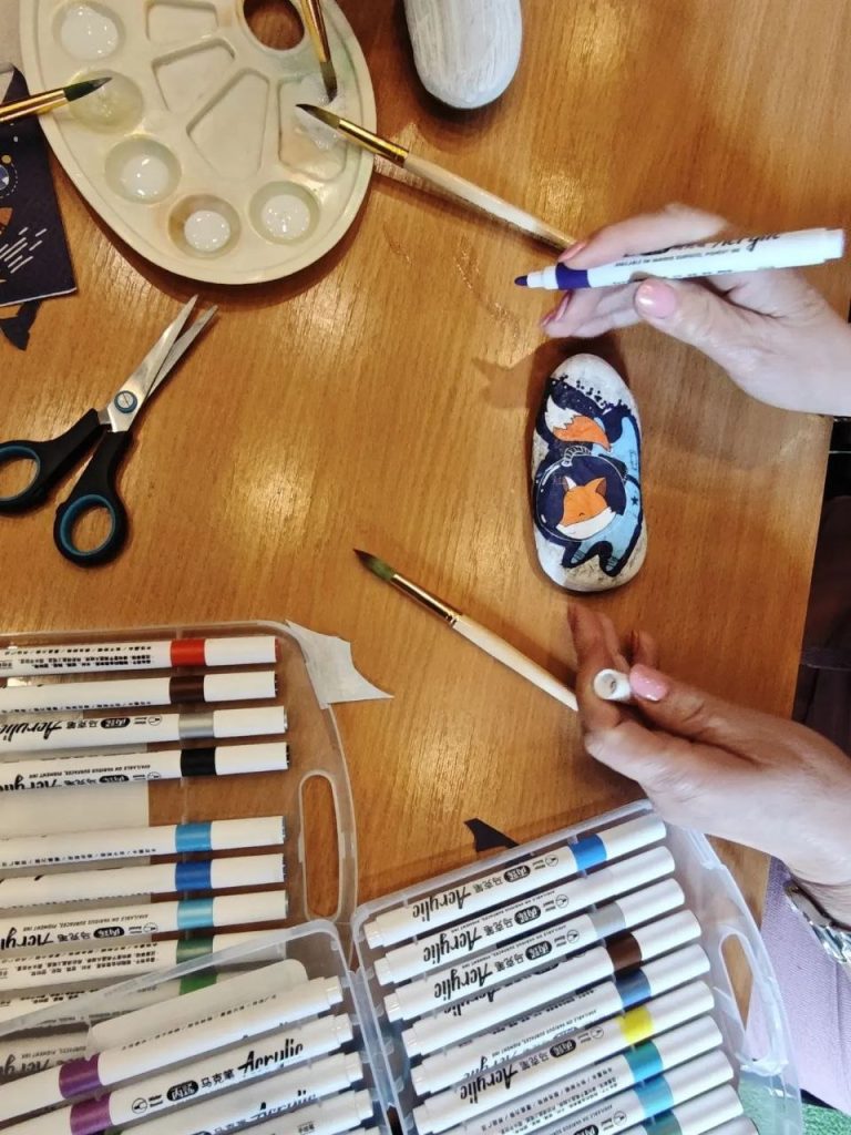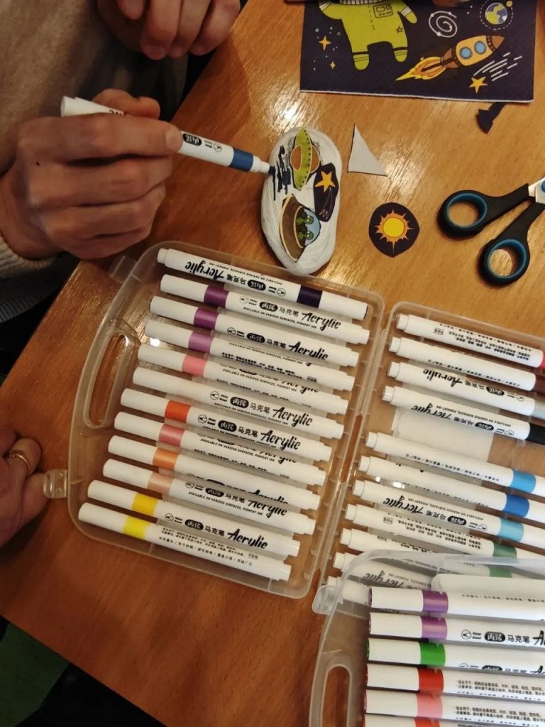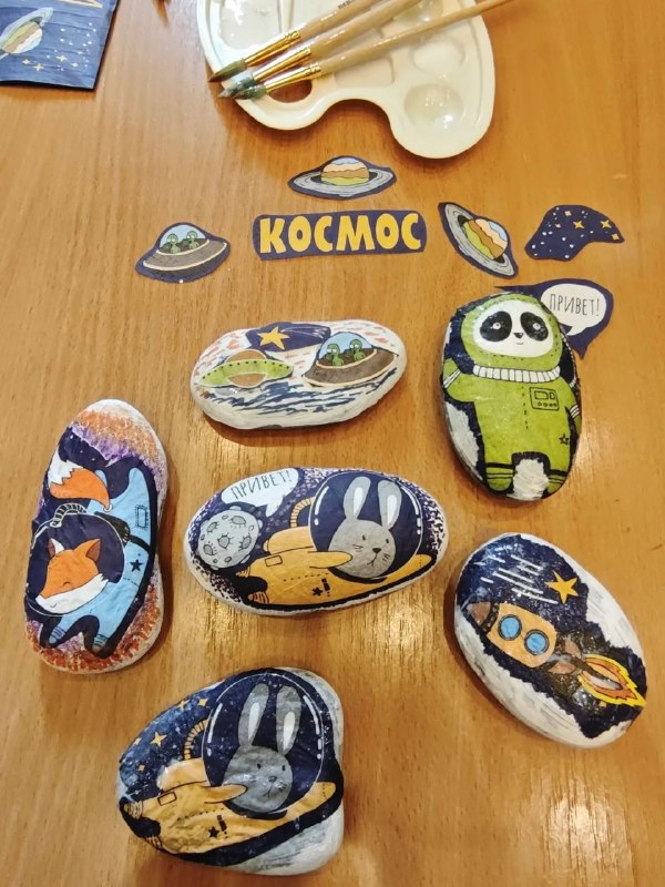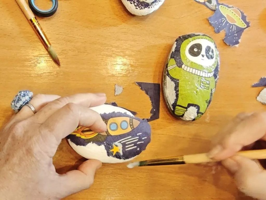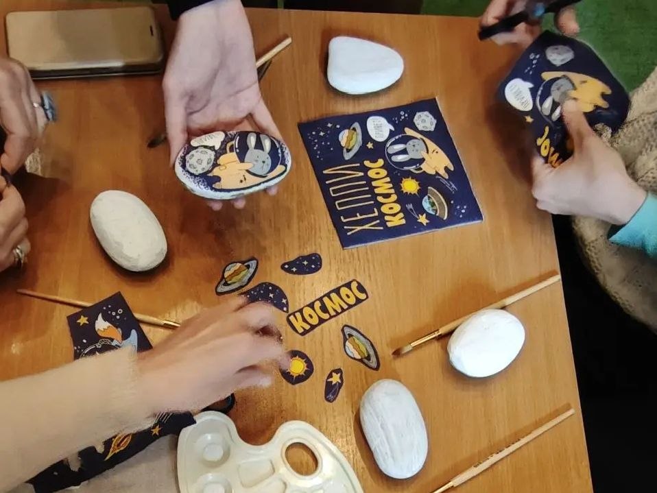 По окончании беседы посетителям предложили присоединиться к творческому занятию и создать памятный тематический сувенир. «Космический» декупаж на гальке вызвал искреннюю радость у посетителей, ведь они смогли создать уникальные интерьерные украшения, которые вскоре украсят их дом.