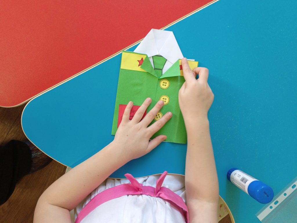 На занятии ребята узнали не только об истории праздника, его становлении и значении, но с большим энтузиазмом пробовали свои творческие силы в изготовлении праздничной открытки в виде офицерского мундира.Малыши непременно порадуют таким сувениром своих близких – отцов, дедушек, старших братьев. У каждого воспитанника Детского центра открытка-мундир, изготовленная собственными руками, получилась интересной и красочной. Благодаря таким творческим занятиям для дошкольников слова «Родина», «патриот», «защитник Отечества» становятся более понятными и близкими.
