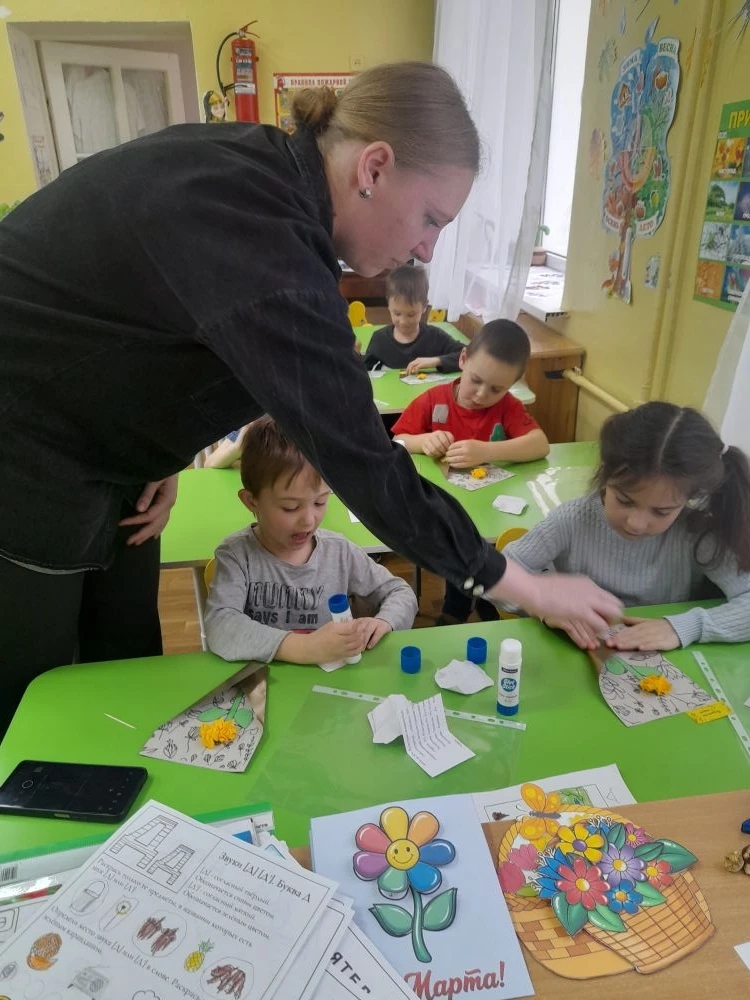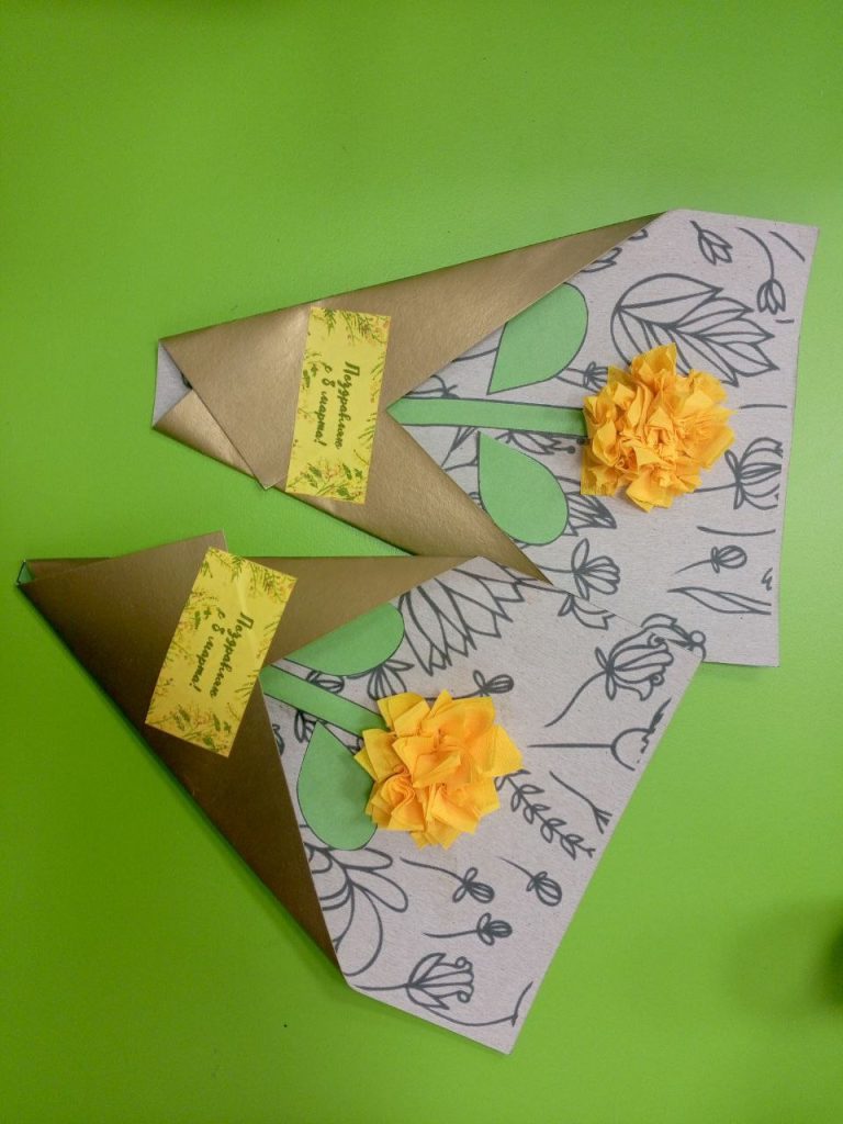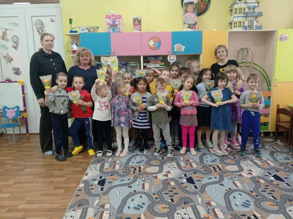 Также ребятам предложили изготовить праздничный сувенир в подарок для любимых и родных женщин. Дети сложили и склеили заготовки, сконструировали цветок, украсили свои весенние «букеты» поздравлением с 8 марта. Все поделки получились разнообразными и яркими.