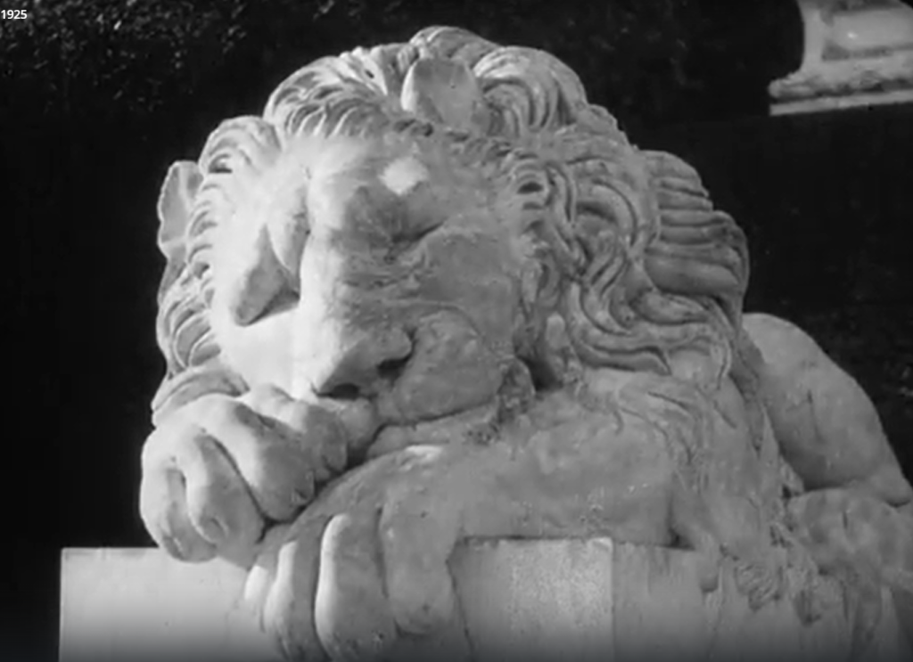 Скульптуры мраморных львов дали возможность показать нарастание революционного подъёма, охватившего всю Одессу в июне 1905 года. Эдуард Тиссэ выхватывает из мрака сначала фигуру спящего льва, за ним возникает пробуждающийся лев. Чёрно-белая киноплёнка даёт динамику теней: чёрный фон рельефно и динамично усиливает глубокие тени в завитках гривы и на мощных лапах царя зверей. А на сером фоне в ракурсе снизу на экране появляется фигура льва, подымающегося на лапы. «Революционный» лев олицетворял город, готовый к битве и героическому сопротивлению.